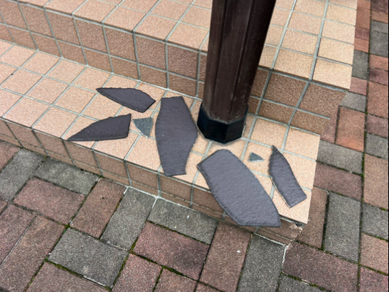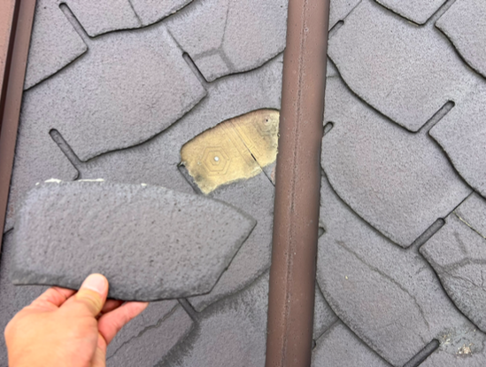 調査の結果、スレート屋根の複数箇所で割れ・欠けが発生し、破損した屋根材が敷地内に落下している状態でした。