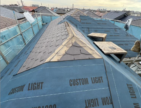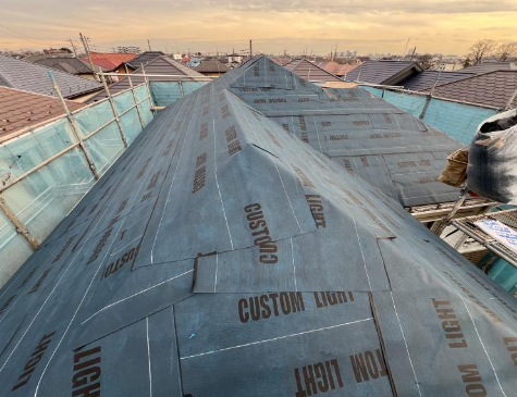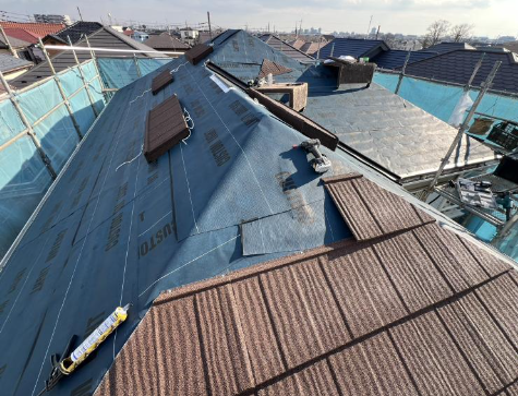 仮設足場を設置後、防水シート(ルーフィング)を施工し、その上からエコグラーニによる屋根カバー工事を実施。